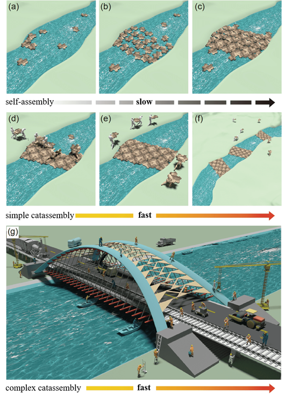 Fig.1 Cartoons of the construction of a floating bridge that illustrate why catassembly is more efficient than self-assembly. Panels a to c represent a self-assembly process, which requires many hours to form a floating bridge. In contrast, with the assistance of porters and builders (corresponding to two kinds of catassemblers), a bridge can be built in 1 hour (panels d and e). After the first bridge is completed, the workers leave it and build other bridges somewhere else (panel f). The more complex the assembly, the more catassembly is required (panel g). To build a complex, multi-functional bridge requires the collaborative work of many workers (such as builders, sentries, transporters, coordinators etc.). Multiple catassemblers are required with varying participation timelines and functions for complex assembly systems.