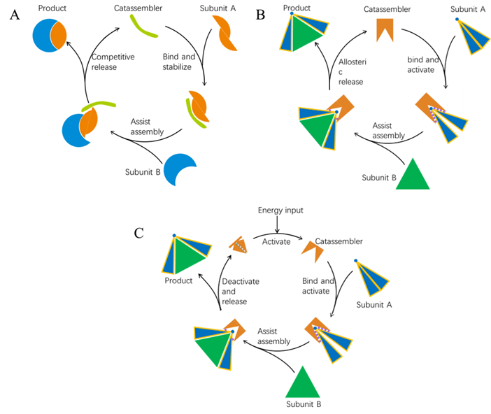 In the first suggested model (Fig. 2A), the catassembler can prevent subunits A from self-formation through irregular interactions, promoting A and B to bind accurately. Subunit B will replace the catassembler and release it from the complex. Catassemblers can act as activators for molecular assembly as the second model (Fig. 2B), The direct assembly of subunits A and B is hindered due to the concealment of their interaction sites. The introduction of a catassembler initiates the assembly process. The catassembler binds to subunit A in an allosteric manner, thereby exposing the binding sites on subunit A. Subsequently, the activated subunit A interacts with subunit B, forming the complex AB. The binding of A and B weakens the interactions between A and the catassembler, resulting in the release of the catassembler. The catassembler then proceeds to locate a new subunit A and starts a new cycle. Furthermore, catassembly can be powered by external energy as the third model. The energy inputs could be in the form of chemical energy, light, electrical energy, etc. Assuming a catassembler exists in a deactivated state, as shown in Fig. 2C, the energy input can activate the catassembler, initiating a catassembly cycle like Fig. 2B. After the assembly finishes, the deactivated catassembler is then released from the product and can be reactivated by further energy input.