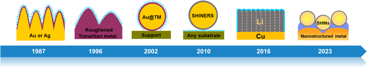 Throughout this developmental journey, SERS has been intimately connected with progress in nanoscience and plasmonic photonics. The establishment of its experimental and theoretical foundations represents the collective wisdom and contributions of numerous scientific pioneers. Particularly noteworthy is how SERS technology has continuously evolved to generate new branches, such as Tip-Enhanced Raman Spectroscopy (TERS) and Shell-Isolated Nanoparticle-Enhanced Raman Spectroscopy (SHINERS). These innovative approaches have not only enriched the SERS family but also provided novel solutions to overcome technical bottlenecks, significantly expanding the applicable range of materials, morphologies, and molecules. These developments have propelled SERS into a multifunctional technology with extensive application prospects.