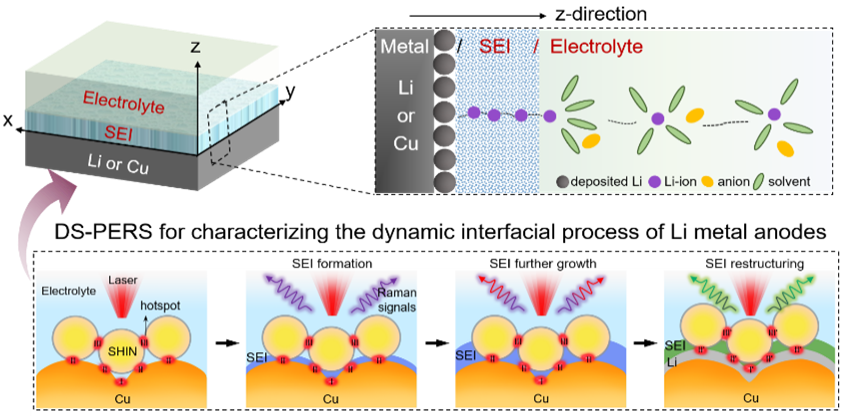 The first approach is to combine SERS of Cu/Li and SHINERS of shelled-isolated Au@SiO2 nanoparticles (SHINs) to monitor the dynamic formation and evolution of SEI of lithium batteries and the related interfaces in z-direction. By leveraging the integrated plasmonic enhancement of nanostructured Cu/Li and SHINs, we have achieved a depth-sensitive detection of signals from the tens of nanometers thick SEI and from the Cu/SEI, Li/SEI and SEI/electrolyte interfaces during SEI formation at different stages. We have unraveled that a primary SEI is formed on the Cu current collector, followed by restructuring and final formation of SEI on Li. Additionally, we have constructed the chemical mapping of Li-ion solvation structure dictated by the SEI at SEI/electrolyte interfaces. These nanoscale and molecular-level information obtained by DS-PERS unravel the profound influences of the metallic Li in modifying the SEI formation and in turn the roles of SEI in regulating the desolvation chemistry of Li-ion and the following Li deposition.