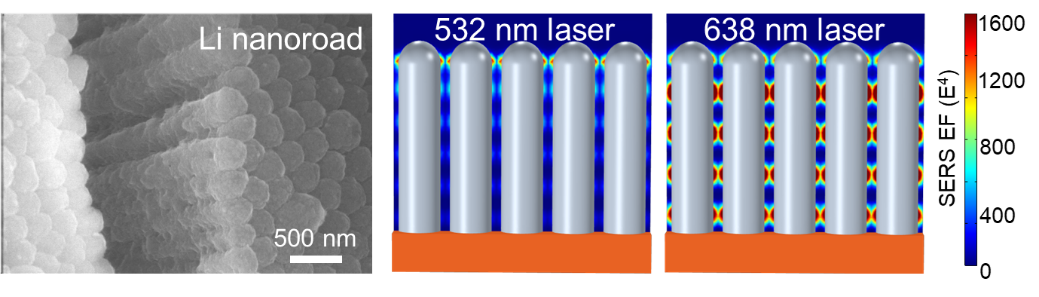 Figure 4. SERS-active Li nanoroads and simulations of the electromagnetic field (EF) distribution on Li nanorod under different laser excitation.