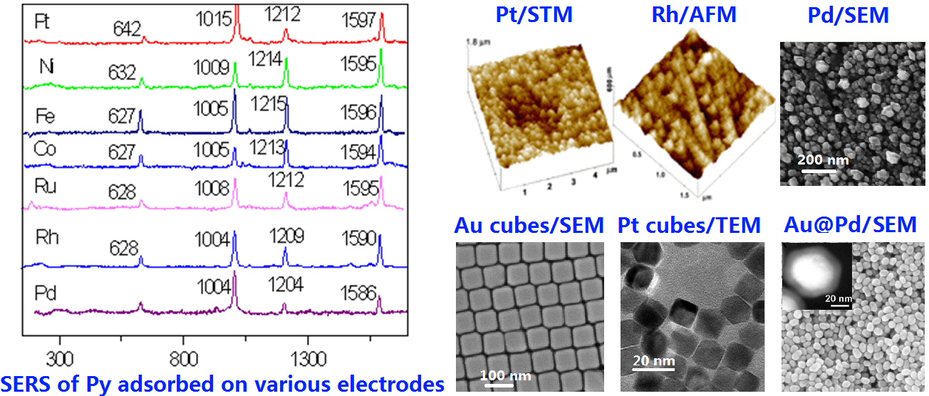 Three approaches have been developed to obtain SERS-active substrates of transition metals (VIII B): 1) Electrodeposition of transition metals onto roughened Au or Ag surfaces. The obtained substrates display high SERS activities, but the ultra-thin coating layers are non-uniform with pinholes. 2) Electrochemical roughening of pure transition metal surfaces. Raman signals can be directly obtain on pure transition metal electrodes for the first time, but the enhancement is not sufficient enough to investigate some important interfacial phenomena, such as water adsorption. 3) Chemical deposition of ultra-thin (ca. 1–10 atomic layers) transition metals onto Au nanoparticles. The substrates exhibit high SERS activity with uniform morphology and pinhole-free, but it is quite difficult to apply to many other materials, and impossible to work on the smooth surface.