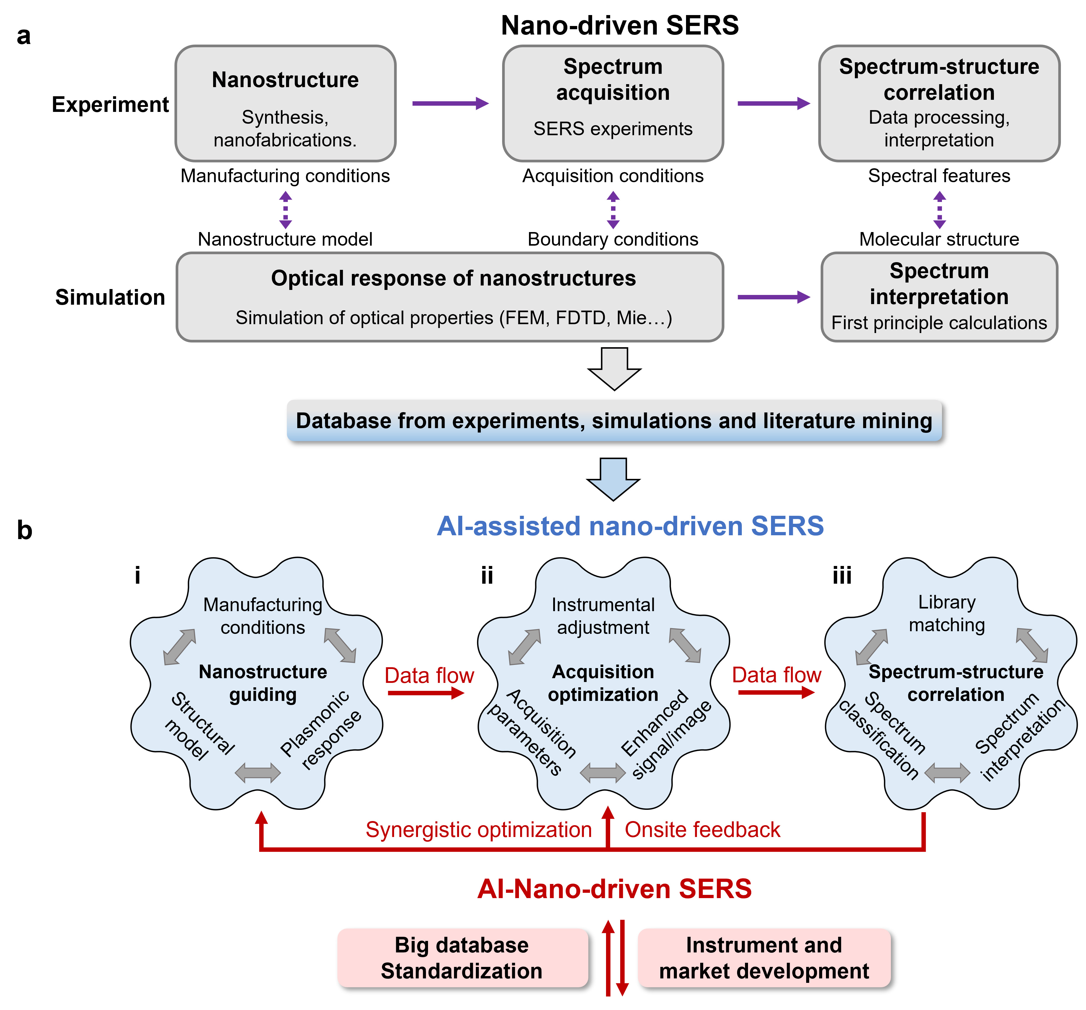 We propose that AI technology has the potential to solve these problems. However, current AI+SERS research is still at the stage of AI-assisted SERS research and can be divided into three categories: design and preparation of nanostructures, optimization and control of intelligent instrument systems, and analysis of Raman spectral-molecular structure relationships. The latter category accounts for more than 90% of current AI+SERS research, while the first two directions have received minimal attention, and there is an even greater lack of interaction between all three areas. There is an urgent need to implement spontaneous internal data exchange and generation that drives autonomous optimization with real-time feedback decision-making. This would integrate the three directions into a self-driven closed-loop AI-Nano-driven SERS research paradigm. Such a breakthrough would likely enable the standardization and intelligent development of SERS technology, thereby strongly promoting its market expansion.