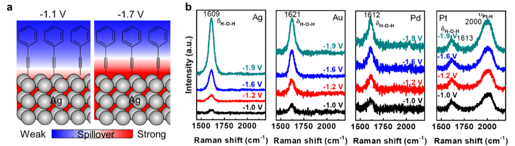 The second approach is to develop a plasmonic molecular ruler strategy that combines in-situ electrochemical PERS with theoretical analysis to elucidate the specific characteristics of interfacial electronic spillover at electrochemical interfaces under very negative potentials. Utilizing specific molecules adsorbed onto metallic electrodes (Pt, Pd, Au, and Ag) as molecular rulers, we have achieved angstrom-level spatial resolution in measuring electron spillover from the electrode to the electrolyte. Notably, we observed abnormal spectral features in the libration (network motion) of interfacial water and believed to result from the synergy between spilled electrons and surface plasmons (SPs), having a sharply gradient distribution. It may spark a new idea regarding the creation of special interfacial structures and processes of electrochemical interfaces unprecedentedly.
